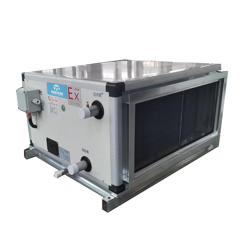 水冷型吊頂式防爆空調(diào)機組 吊頂式空氣處理機組適用于阻力大于100的空調(diào)系統(tǒng),是一種集中式空氣處理系統(tǒng),它起源于設備集中設置,