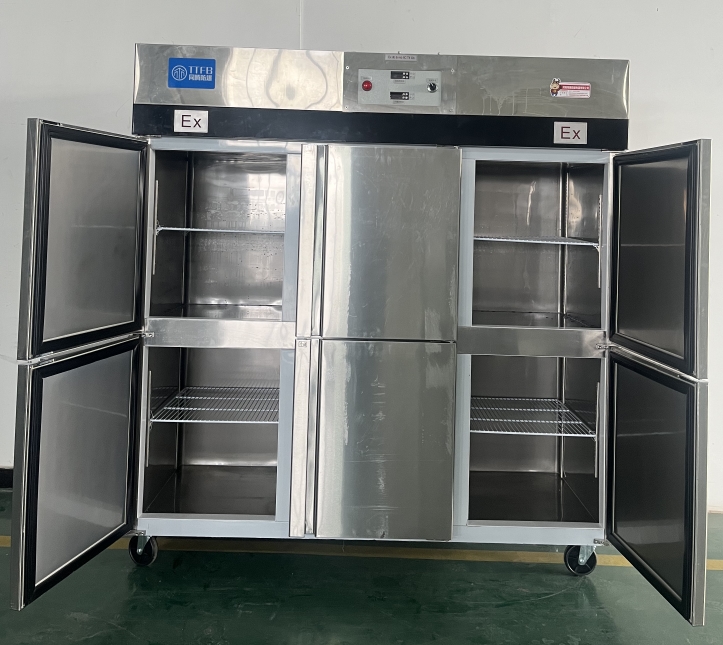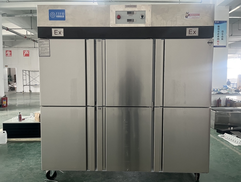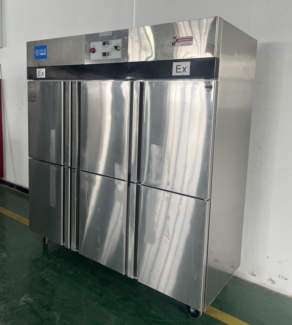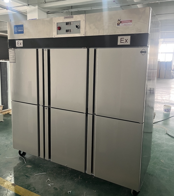 我公司生產(chǎn)的六門不銹鋼同騰防爆冰箱(以下簡稱防爆冰箱),產(chǎn)品防爆要求是根據(jù)GB3836.1-2010《爆炸性環(huán)境 第1部分:設(shè)備 通用要求》、GB3836.2-2010《爆炸性環(huán)境 第2部分:由隔爆外殼“d”保護(hù)的設(shè)備》、GB3836.4-2010《爆炸性環(huán)境 第4部分:由本質(zhì)安全型“i”保護(hù)的設(shè)備》、GB3836.9-2006《爆炸性氣體環(huán)境用電氣設(shè)備 第9部分 澆封型“m”》及GB3836.15-2017《爆炸性氣體環(huán)境用電氣設(shè)備 第15部分:電氣裝置的設(shè)計(jì)、選型和安裝》的規(guī)定制成防爆結(jié)構(gòu),經(jīng)國家授權(quán)的質(zhì)量監(jiān)督檢驗(yàn)部門檢驗(yàn)合格,其防爆標(biāo)志為ExdbibmbⅡCT4 Gb。適用于工廠存在或可能存在ⅡA、ⅡB級(jí)、ⅡC,T1~T4組可燃性氣體、蒸氣與空氣混合形成的爆炸危險(xiǎn)1區(qū)或2區(qū)場所。該產(chǎn)品經(jīng)國家防爆電氣產(chǎn)品質(zhì)量監(jiān)督檢驗(yàn)中心檢驗(yàn)合格并取得了防爆合格證。空調(diào)機(jī)廣泛適用于石油、化工、冶金、制藥和國防工業(yè)等空氣中存在爆炸性氣體混合物的自封閉的室內(nèi)之用。
